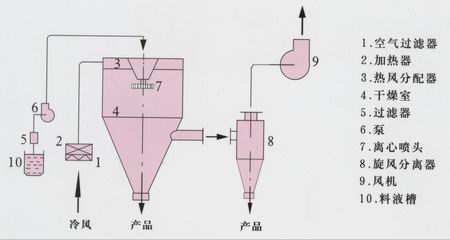 | 空氣經(jīng)初效過濾器、加熱器加熱和熱風(fēng)分布屏后,干燥介質(zhì)熱空氣呈直線狀(或螺旋狀)均勻地進(jìn)入干燥器內(nèi)。被干燥料液由料液槽經(jīng)過過濾器由高壓泵送至干燥塔頂部干燥器內(nèi)的霧化器(壓力噴頭),使料液噴成極小的霧狀液滴。霧化后的料液和熱空氣并流接觸,水分迅速蒸發(fā),在極短的時間內(nèi)干燥為成品。成品由干燥塔底部和旋風(fēng)分離器排出,廢氣由風(fēng)機(jī)抽走排出。根據(jù)我公司多年的生產(chǎn)實(shí)踐及干燥物料的不同特性,壓力噴霧干燥機(jī)系列設(shè)備因噴霧形式不同可分為:順流式、逆流式和混流式;因噴霧壓力高低不同可分為:高壓噴霧式、中壓噴霧式和低壓噴霧式三種。 |
